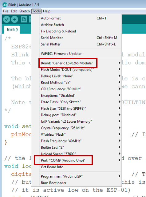 Before compiling the code, we need to select the correct platform. Go to “Tools” and pick the “Generic ESP8266 Module” for your board. Make sure that you also connect your Arduino board to your computer and select the respective COM port for your board. Example below.
