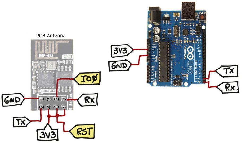 The first thing to have in mind is that we are using the serial pins of the ATmega chip that is interfacing with the USB connector with the serial pins of the ESP8266. And you are reading it right, you will connect the TX with TX and RX with RX.
