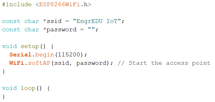 The code is pretty straight forward. Include the ESP8266WiFi library, create two variables, one is related with the name of the network that you want to create and the other variable is the password for your network. You can leave it empty if you don’t want to have a password.