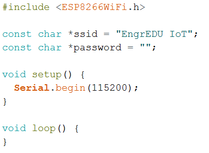 To see if it works, open the Wi-Fi settings on your computer, look for a network called “EngrEDU IoT”, leave the password empty, and connect to it. Then open a terminal, and ping to 192.168.4.1 (this is the default IP address of our ESP AP). You’ll see that the ESP responds to your pings.