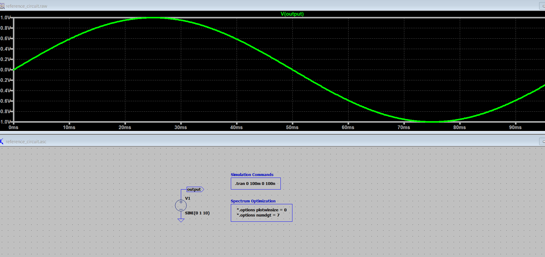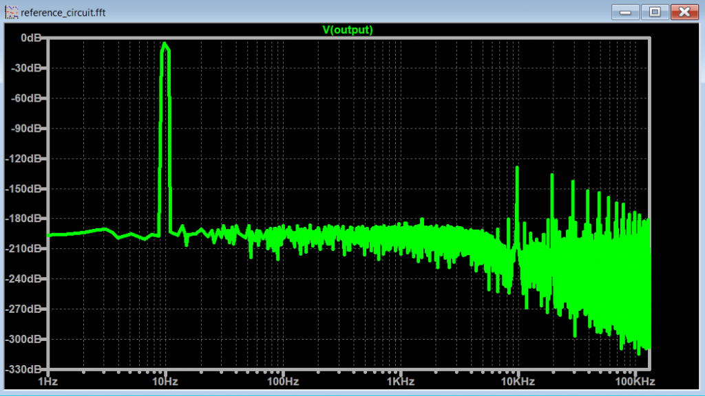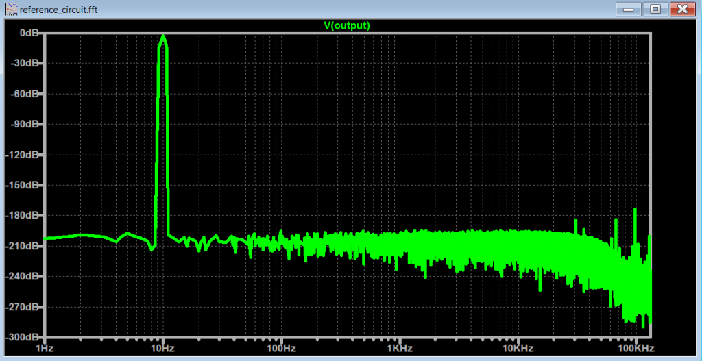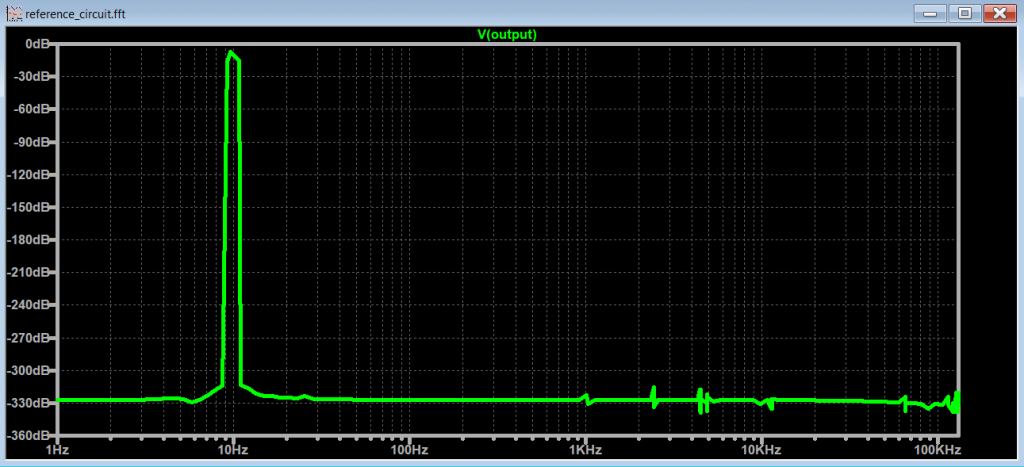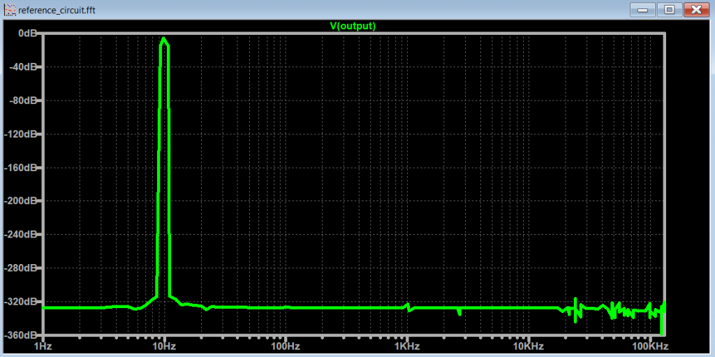 Let’s plot the FFT with the spectrum optimization parameters off and keep the .tran <Tstop> parameter equal to the frequency of the signal (10Hz -> 100ms).
