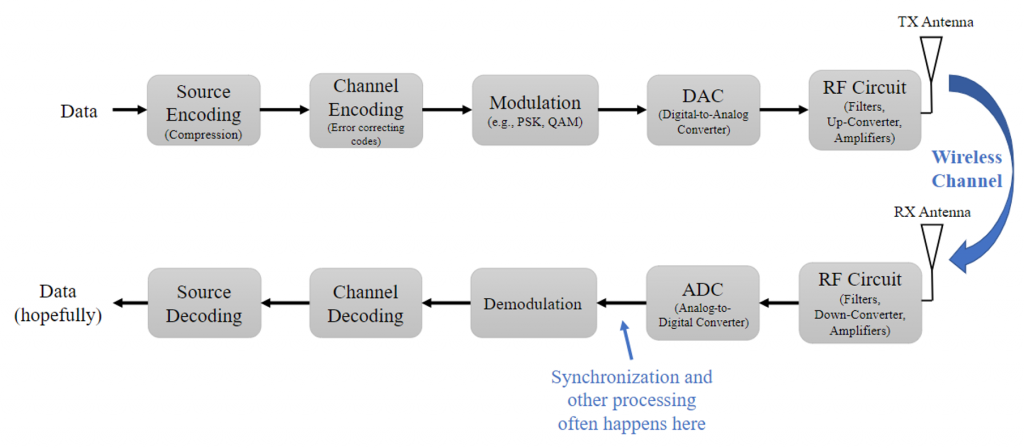 Since we are dealing with SDRs to transmit information between a transmitter and a receiver, another way to organize the concepts presented on the previous section is by using the Transmit-Receive or Tx-Rx Chain block diagram below.