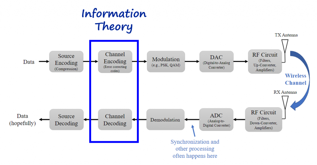 Information theory concepts are normally present on the channel encoding and decoding modules.