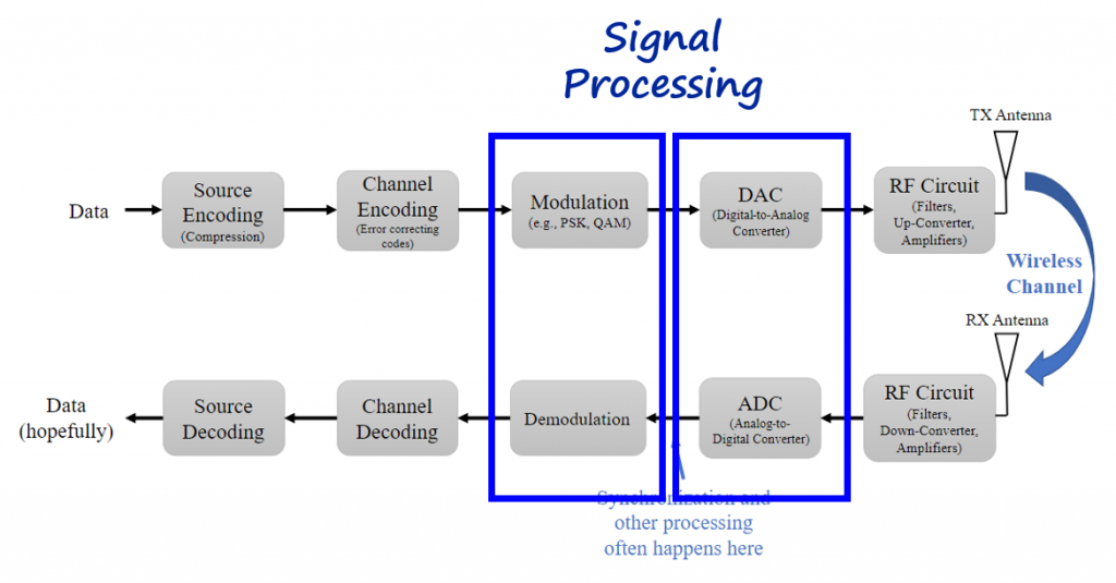 And signal processing concepts (mainly filters and sampling rates adjustments) are present at the modulation, demodulation, DAC and ADC modules.
