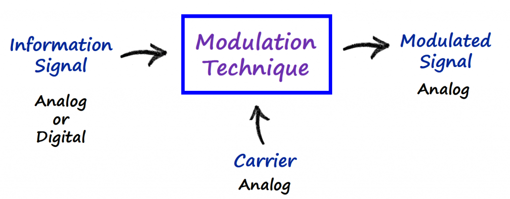- Modulation: is the process of taking either an analog or a digital signal and turning it into an analog signal.