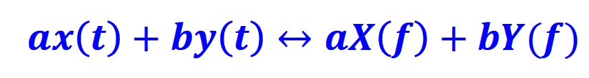 This property is useful when for example we need to add voice and video together on the same communication channel. Adding the signals in time, will add the respective spectrum in the frequency domain. In this simple example, we are adding two sinusoidal waves at different frequencies but we need extra care if the spectrum of the two signals of interest overlap.