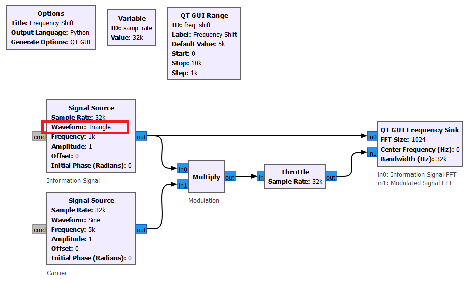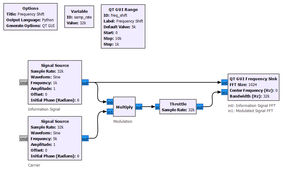 For simplicity, the building blocks below, start by multiplying one sinusoidal waveform at 1kHz as the information signal with a carrier at 5 kHz.