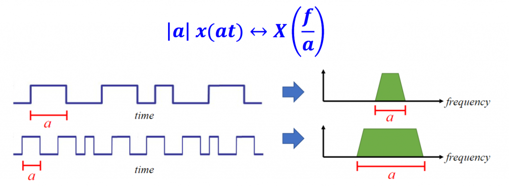 Scaling in time essentially shrinks or expands the signal in the x-axis. When we transmit bits faster we have to use more frequencies.