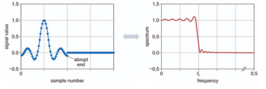 The effects of this in the frequency domain translates to ripples in the passband and the stop band. In essence this shows why you can never have the perfect ideal or ‘brick-wall’ filter.