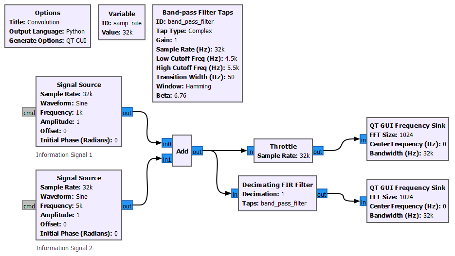 The “Decimation FIR Filter” block uses the fir_filter_XXX function (Link) that creates a finite impulse response (FIR) filter that performs the convolution in the time domain. There are a couple of different ways to define and create filters specs (or taps) with GNURadio, but for now we are using the “Band-pass Filter Taps” block that creates the desired specs in a more user friendly way.
