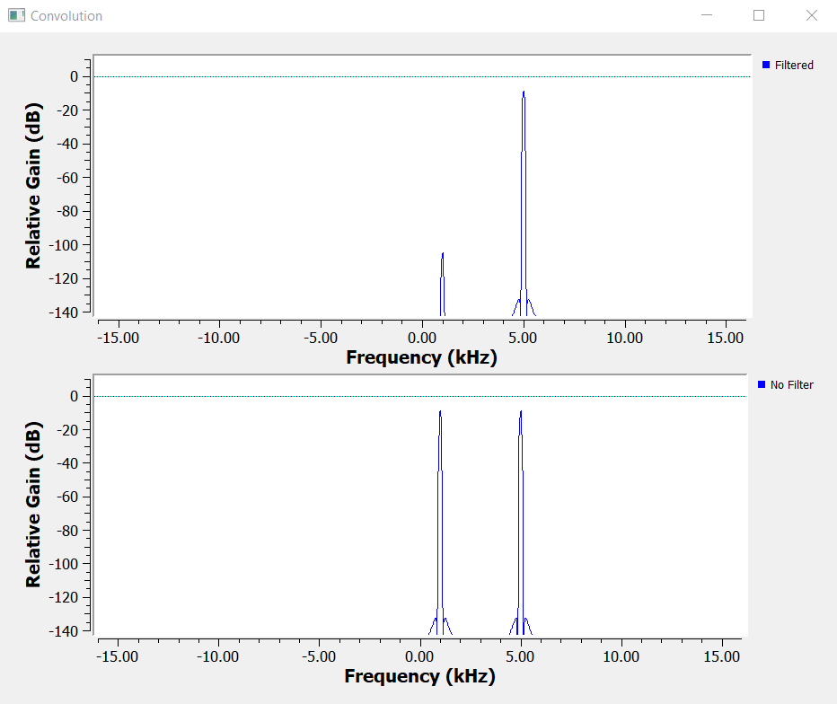 The result after applying the band pass filter around information signal 2 (@ 5kHz), is the considerable reduction of the information signal 1 amplitude (@ 1kHz).