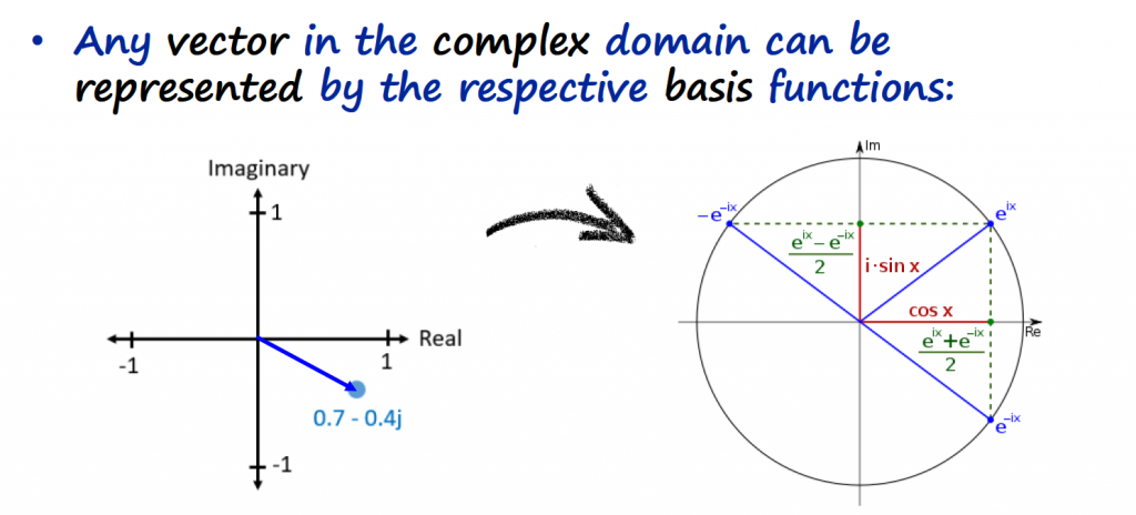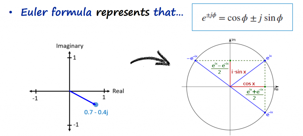 Euler formula is just telling us that any complex vector is a combination of a cosine and sine basis function, orthogonal to each other. For now, we are going to accept this, and I will leave the explanation on how to get to the Euler formula this article (Link).