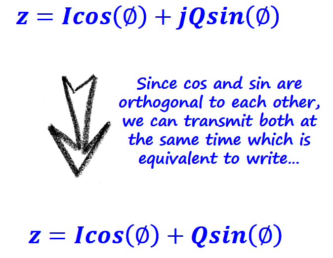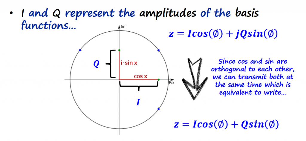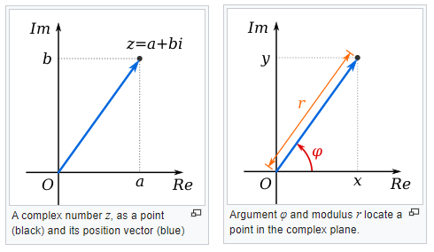 In essence we are representing the information signal as a complex number (we will see later how that conversion/representation is done), that contains a real and imaginary part. We can write those complex numbers in the complex plane (or Argand diagram) as a cartesian coordinate (z = a + bi) or as polar coordinate (z = r ∟ϕ).