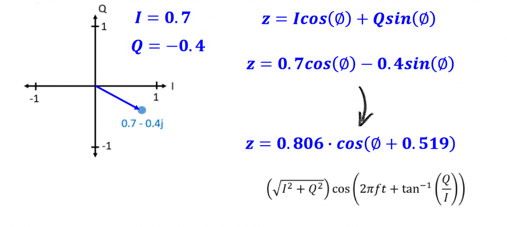 Let’s go over on how to transmit IQ data, and let’s assume that we want to transmit the complex number 0.7 – 0.4j or the respective IQ value 0.7cos(θ) – 0.4sin(θ)