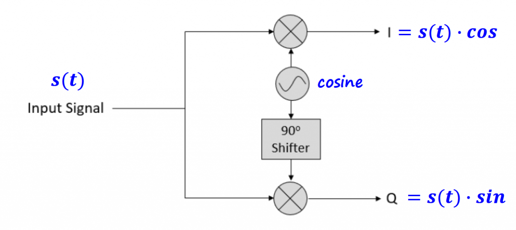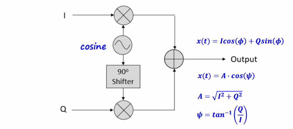 In terms of block diagram, we need to feed the I and Q values to the respective multiplication block. We only need to have one sinusoidal waveform (cosine) and shift it by 90 degrees to obtain the orthogonal signal.