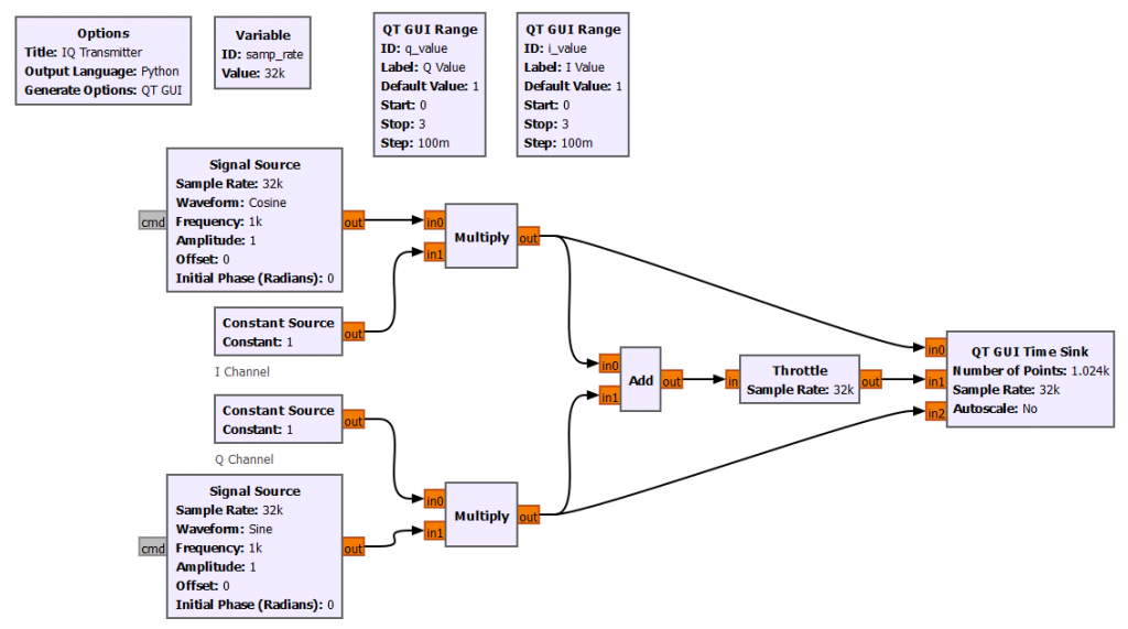 In terms of GNURadio building blocks, the block diagram below shows the simple concept of an IQ transmitter.
