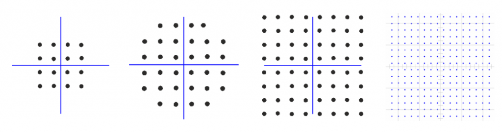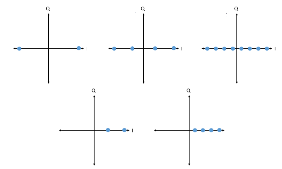 When the IQ plots start representing information being transmitted, the points on those plots form patterns that are called constellations. Constellations can have different shapes depending on the type of modulation scheme and it can become quite busy…