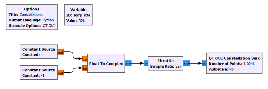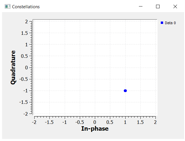 To visualize constellations in GNURadio, we can use the block “QT GUI Constellations Sink“. The example below, plots the IQ value 1 – 1j (4th quadrant).