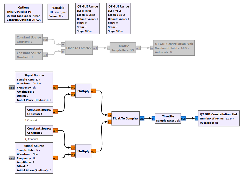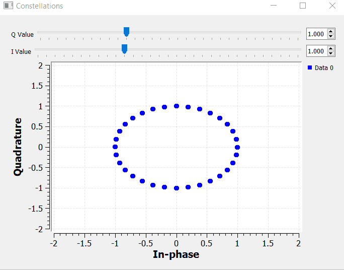 We can also add the constellation sink block to the IQ transmitter block diagram presented on the previous section and observe how the IQ values get mapped into the constellation map.