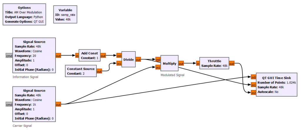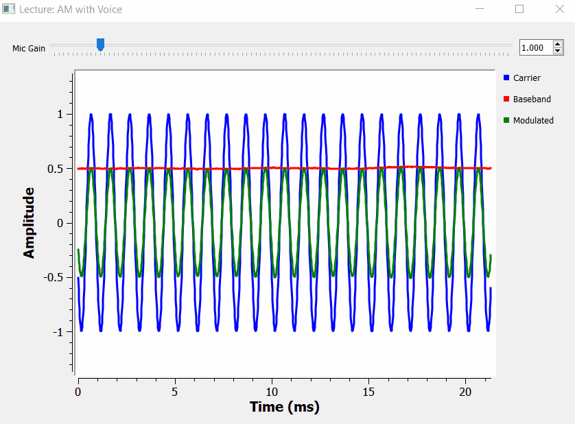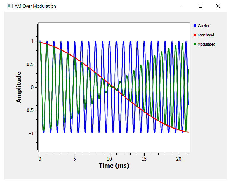 The time domain signal has a small problem that we will be fixing it soon, but for now we can see the amplitude of the carrier (red line below) being modulated by the information signal (blue line below).