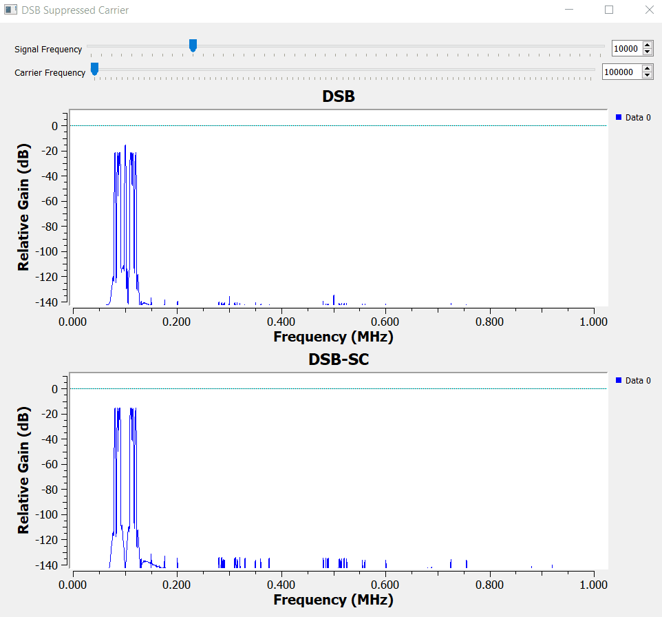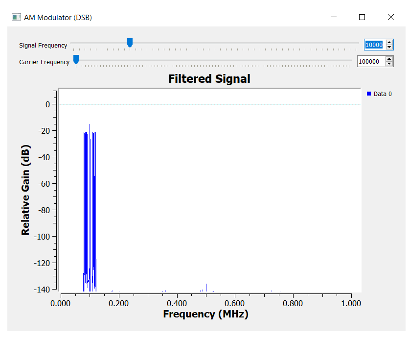 Notice on how the carrier is now present in the spectrum. Including the carrier into the modulated signal is a technique that will be useful for coherent demodulators (or synchronous demodulators).