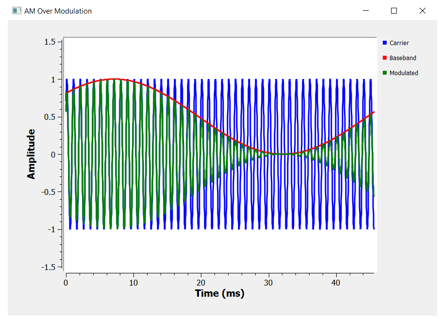 Notice that the baseband signal (or information signal) doesn’t follow the amplitude of the modulated signal. We see an undesired phase inversion that it is called over modulation.