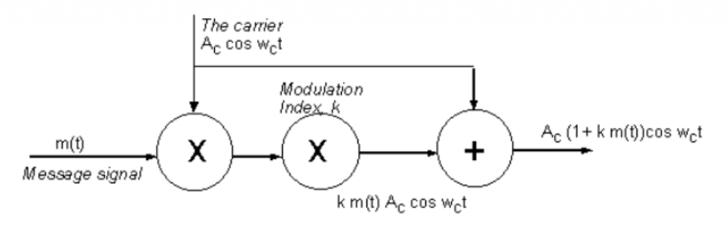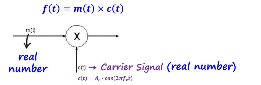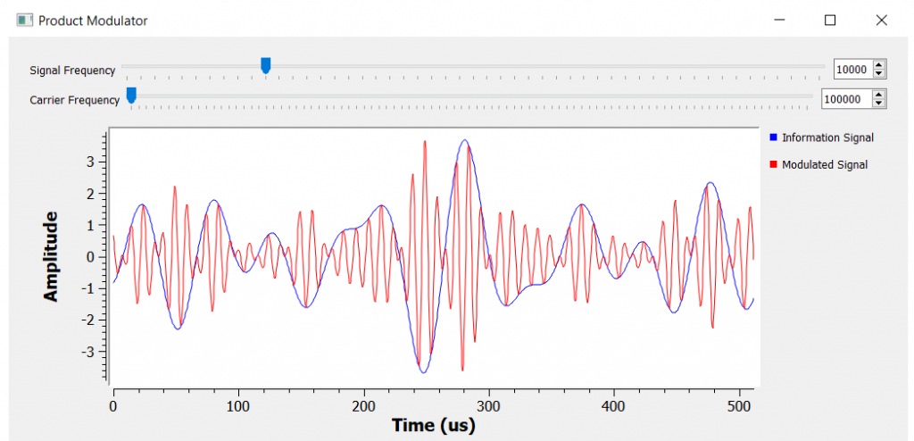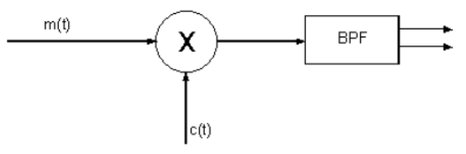 Modulation can be achieved in several ways. The simplest type of modulator for nearly all modulation schemes is called Product Modulator. Remember that the goal of modulating a signal, is to load the information signal (m(t)) into the carrier (c(t)). The frequency of the carrier is generally way higher than the frequencies of the information signal and that is useful for transmitting the information signal over longer distances.