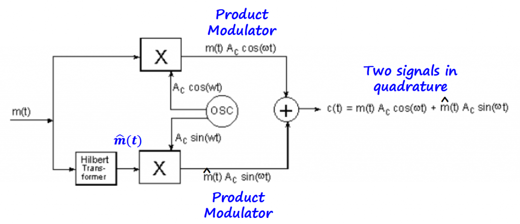 The SSB modulator applies the Hilbert transform to the information signal creating two signals in quadrature.