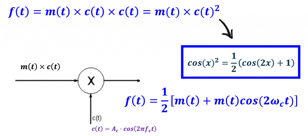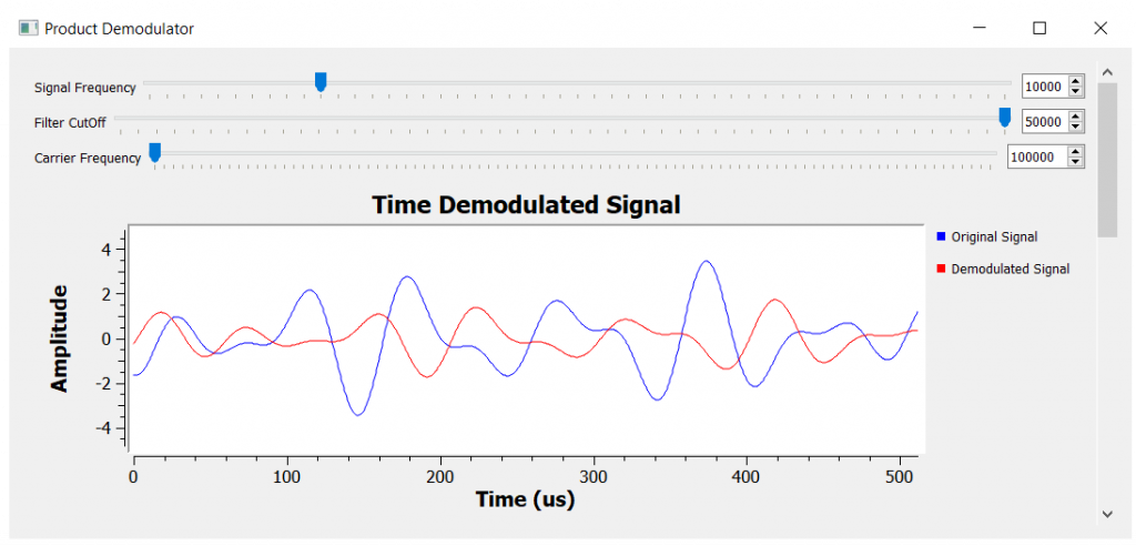 This example uses an asynchronous product modulator to bring the information signal (or baseband signal) down the spectrum (highlighted in green) to a position where we can apply a low pass filter (highlighted in blue) to recover the information signal (highlighted in red).