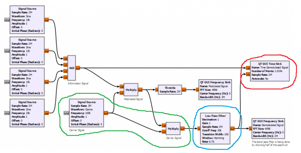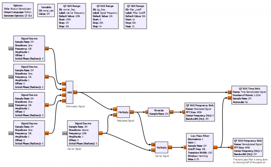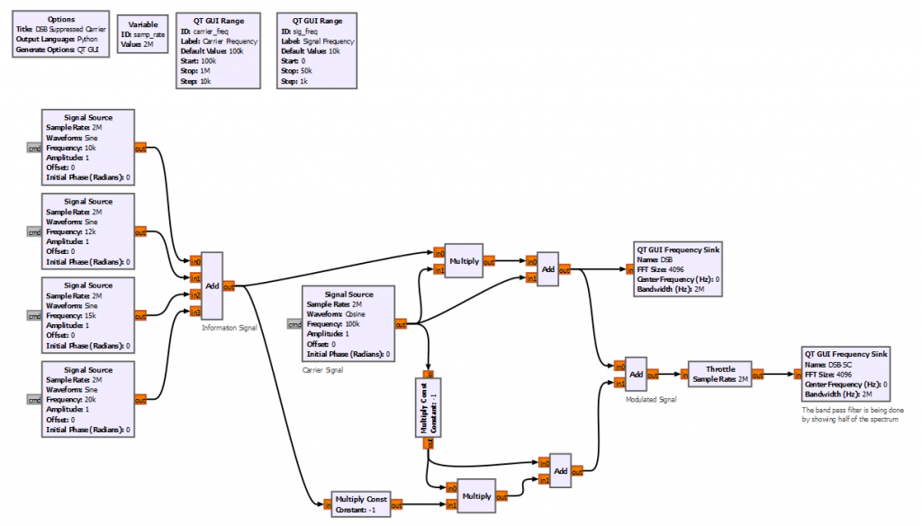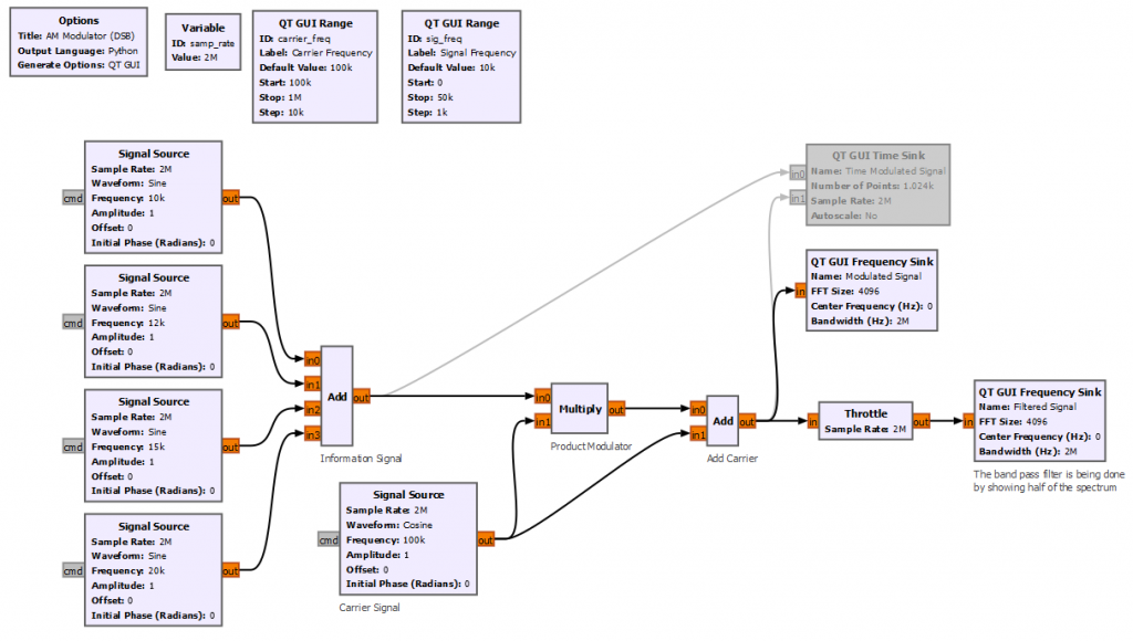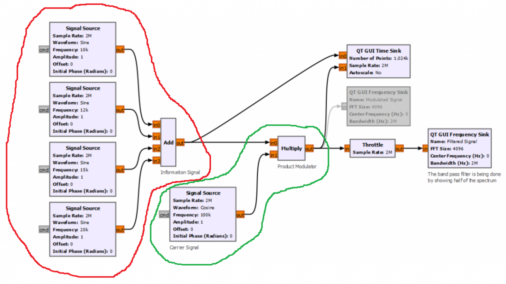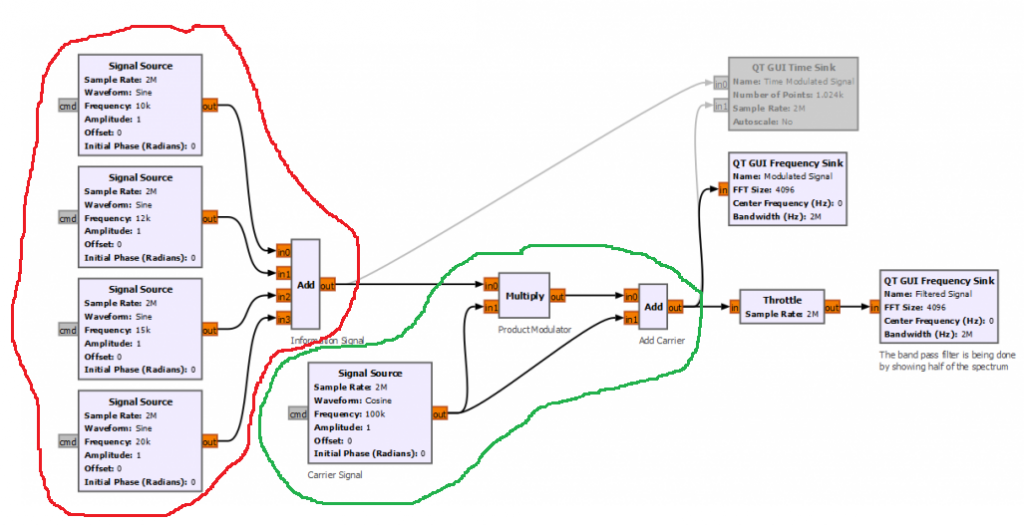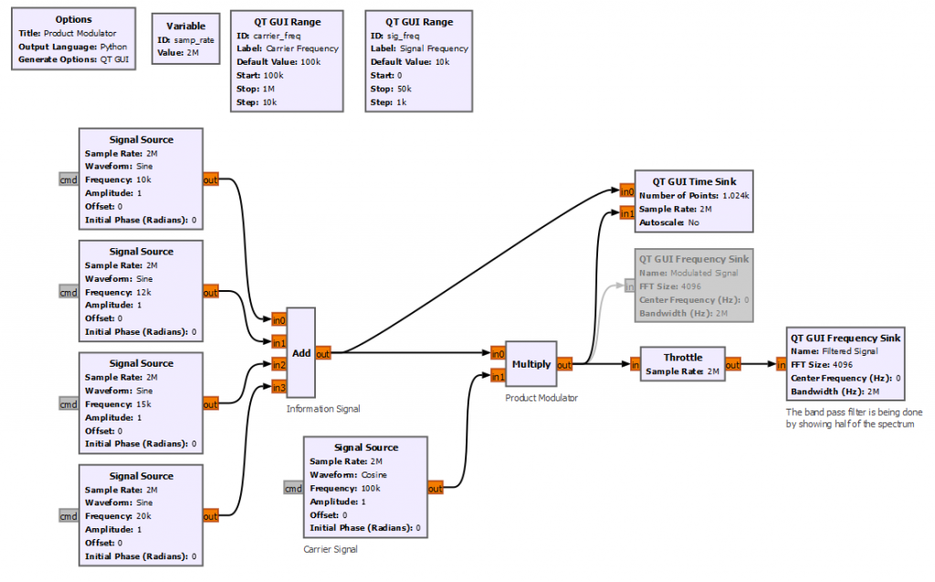 Let’s start by implementing the simplest product modulator with GNURadio. For simplicity the block diagram below creates 4 different sinusoidal waveforms with frequencies between 10 to 20 kHz. The carrier frequency is set to 100 kHz.