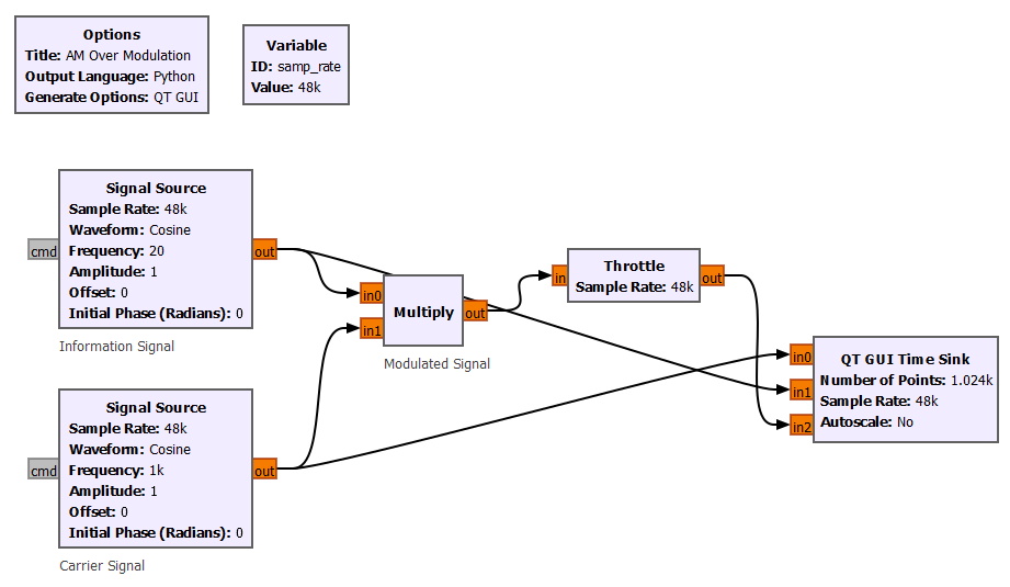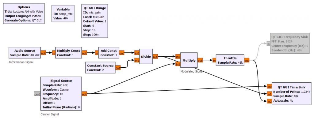 We have been implementing the AM schemes with GNURadio flowgraphs, and this section goal is to relate these flowgraphs with the Tx-Rx Chain block diagram introduced in the Intro section of the Analog Data to Analog Signal topic.