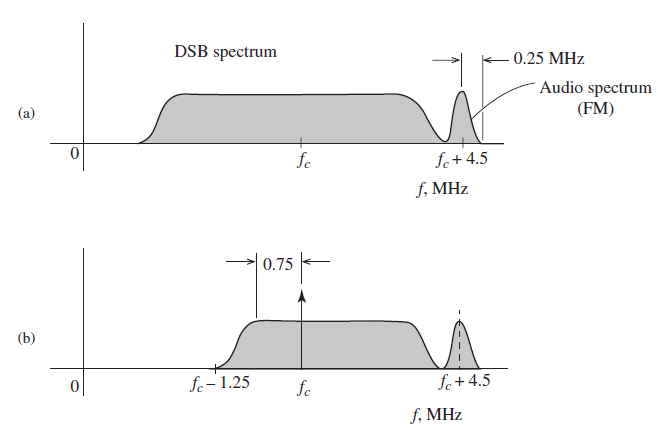 Figure a) below shows the entire DSB spectrum and b) shows the actual VSB signal transmitted after filtering one sideband, reducing the bandwidth of the transmitted signal.