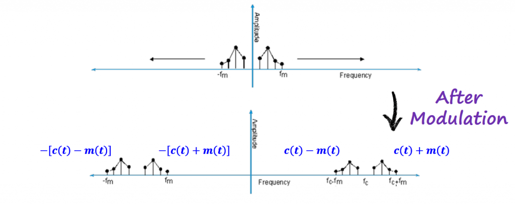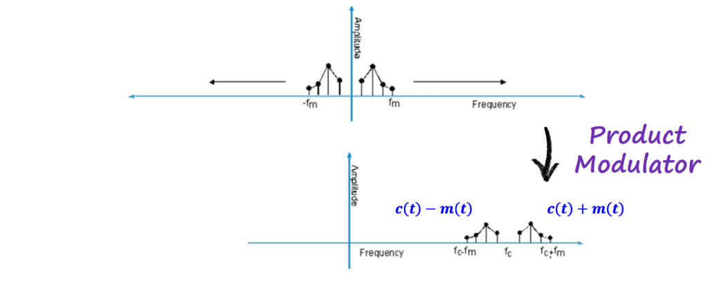Going back to the product modulator, multiplying a signal in time with a pure sinusoidal waveform, corresponds to shifting the spectrum of the information signal in the frequency domain by the carrier frequency.