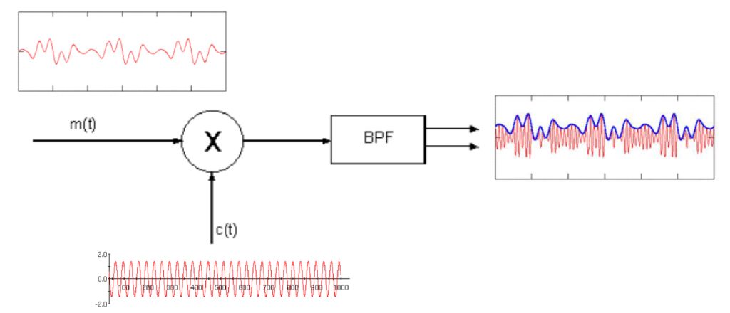 In terms of time domain signals, we get the information signal to modulate the amplitude of the carrier signal.