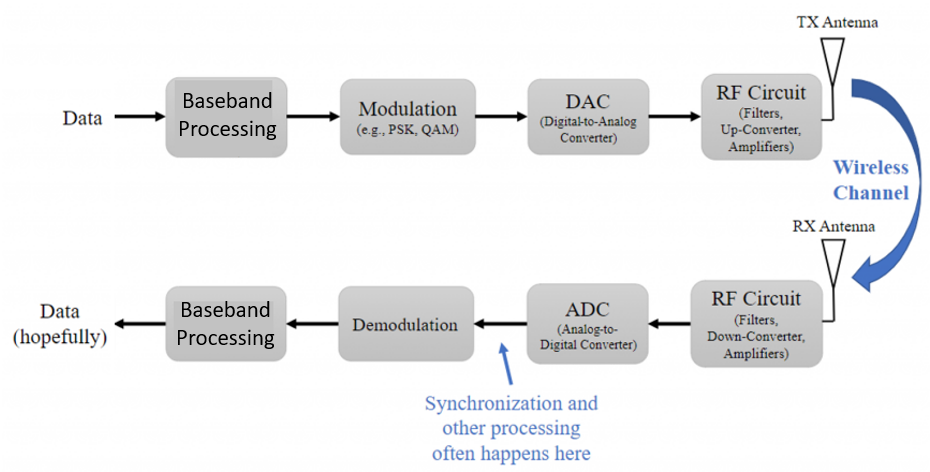 I believe there is value to spend some time understanding this level of abstraction because flowgraphs can easily become complex and overwhelming. Connecting the GNURadio blocks into the Tx-Rx Chain block diagram can help with the understanding of more complex flowgraphs.