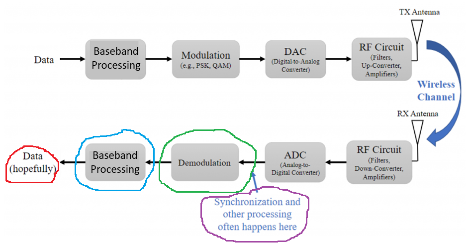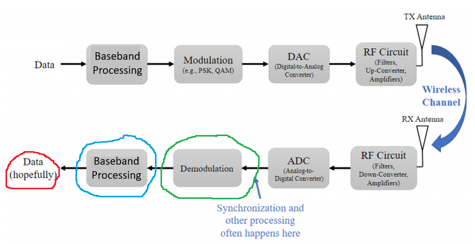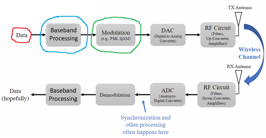 There is not much baseband processing happening here, but to use it as an example, I considered the Multiply Const block a baseband processing module.