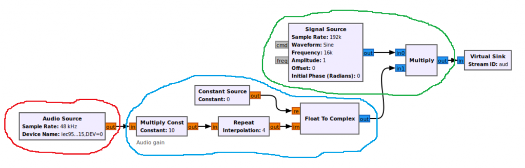 We can make the over modulation GNURadio project a bit more realistic. We can substitute the signal source by an audio source module (the microphone), and modulate the carrier with our voice.