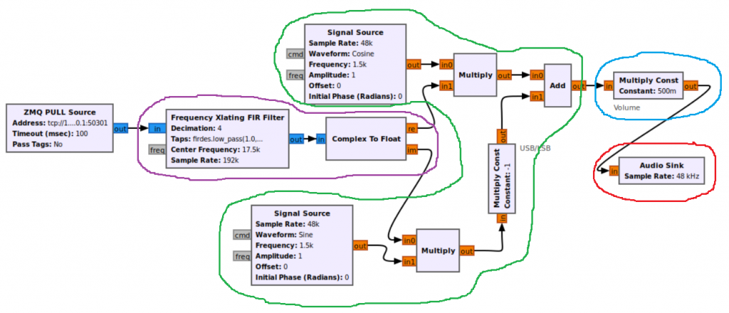 The Frequency Xlating FIR Filter (highlighted in purple) is applied first to the received signal to remove the frequency of the carrier, and it also applies a low pass filter. The signal is then frequency translated again (highlighted in green) to recover the upper or lower sideband of the information signal.