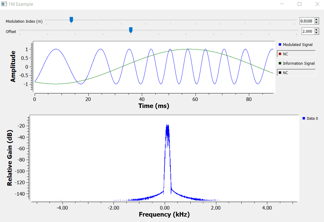 In this particular example, I am plotting in green an FM modulated signal with kf = 4, and in red an FM modulated signal with kf = 2. Then I am varying the information signal (m(t)) frequency between a range of values back and forth.