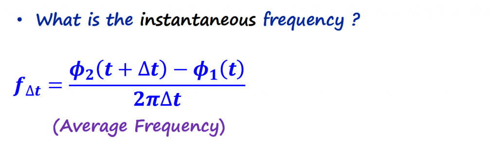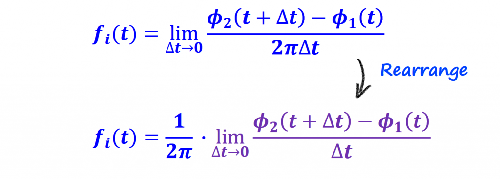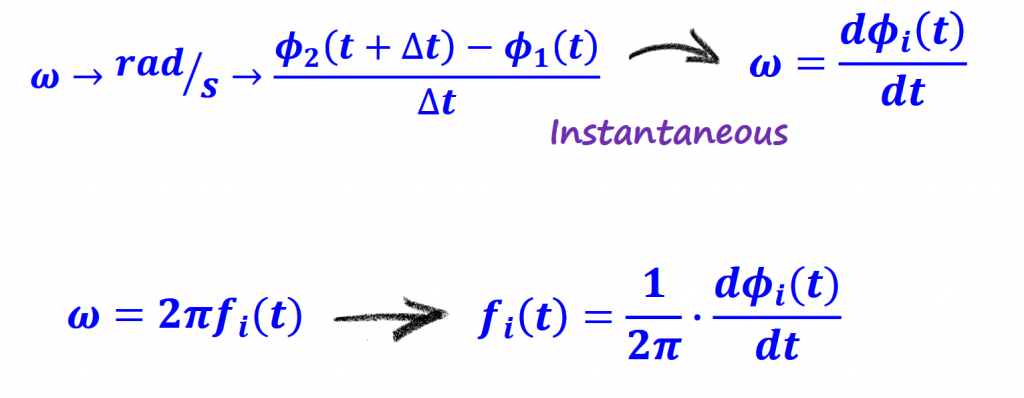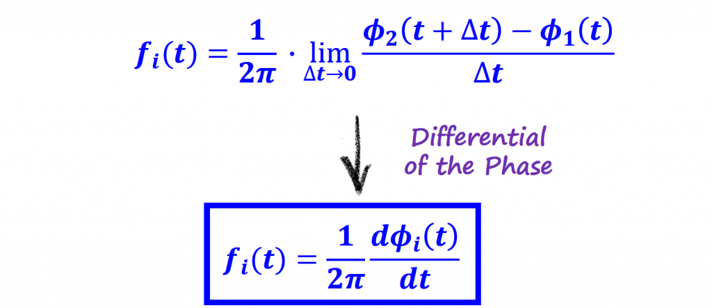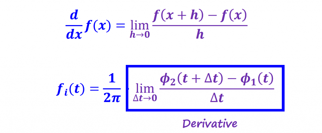 Knowing the concept of derivatives make our life easier to find an equation for the instantaneous frequency. Briefly, it is easier to understand that we can compute linear velocity by measuring two positions at different times and subtract them, which in essence is doing a derivative of the position over time. The same steps can be taken with angular positions to find angular velocity.