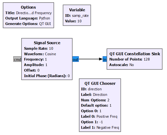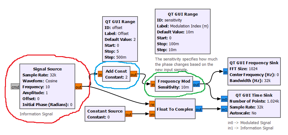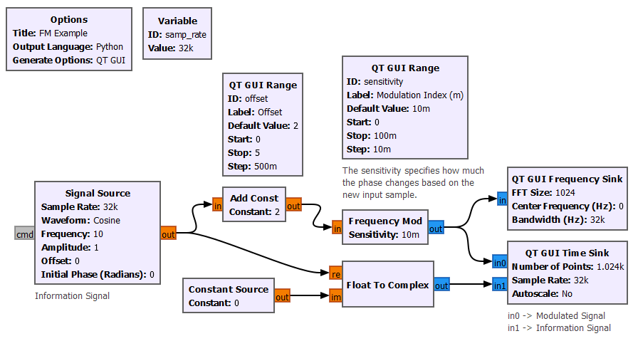 We implemented the FM scheme with GNURadio flowgraph, and this section goal is to relate this flowgraph with the Tx-Rx Chain block diagram introduced in the Intro section of the Analog Data to Analog Signal topic.