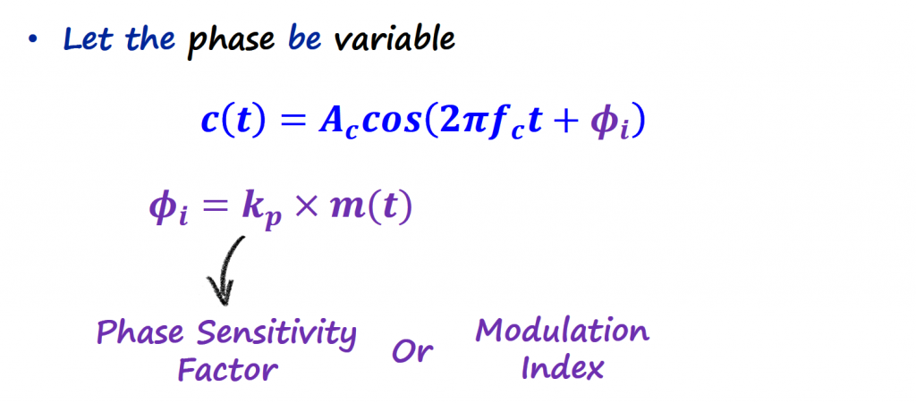 The information signal (m(t)) is now part of the phase of the carrier (c(t)). The constant value (kp) is called modulation index, and it can be used to regulate the amplitude of m(t).