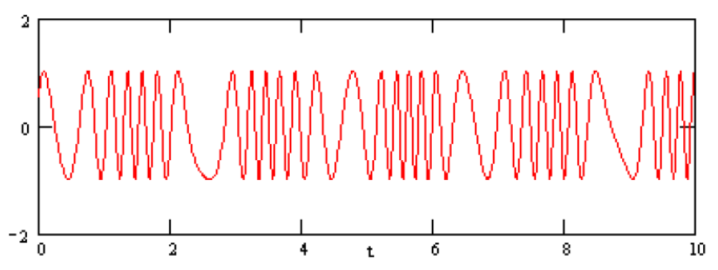 I think it is also cool to see the time domain signal of the resulting FM modulation. Plugging in all the required equations on Desmos, we get the following result:
