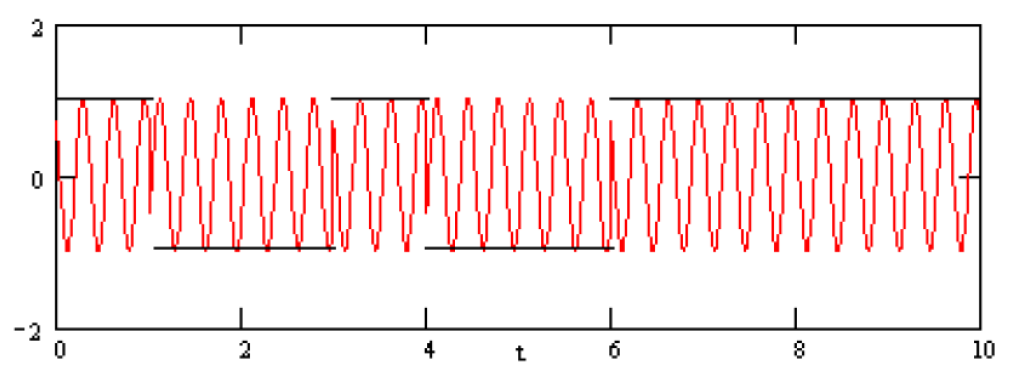The Desmos animation below can help with visualizing the phase changes for different types of information signals (m(t)). The green line is the carrier and you can turn on and off any of the 3 signals to modulate the carrier’s phase accordingly.
