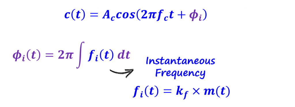 FM modulation is a variation of angle modulation. For FM we are modulating the instantaneous frequency with the information signal (m(t)). We need to rearrange the carrier equation to include the instantaneous frequency. This is where the instantaneous frequency equation and respective angular position equation derived in the previous section comes handy.