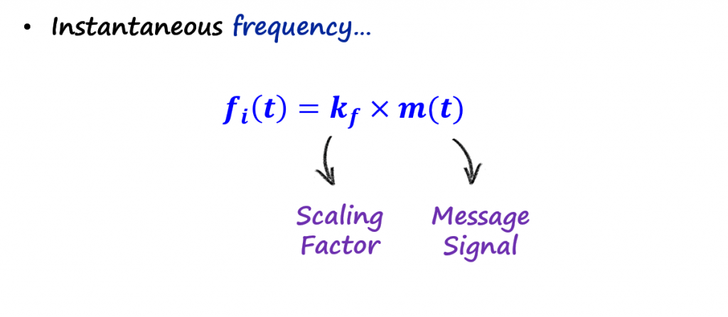 FM signals vary the instantaneous frequency in proportion to the information signal (m(t)). This means that the carrier frequency is changing continuously at every instant. At first glance this doesn’t make much sense, since to define a frequency, we must have a sinusoidal signal at least over one cycle (or half-cycle or a quarter-cycle) with the same frequency.