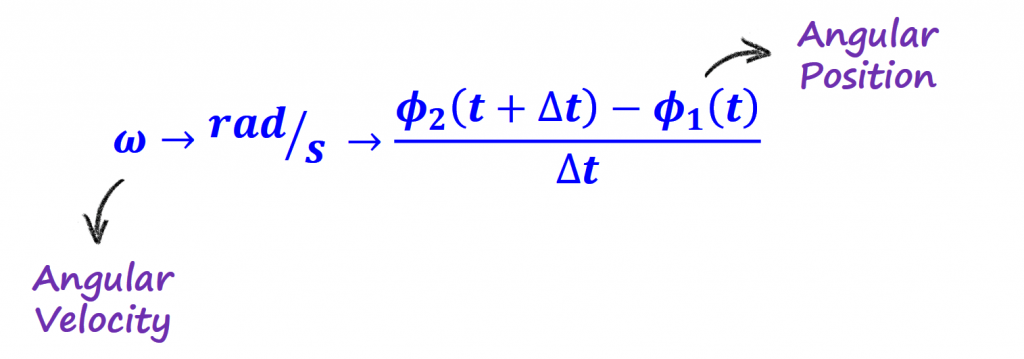 What I like about the animation above, is the fact that we can represent the same concept with two different views. We will focus on the graph with the blue dot for now. That graph shows a circular motion, and from that graph the angular velocity is how fast that blue dot is moving around the circular path. We can find that angular velocity by subtracting two angular positions over time.