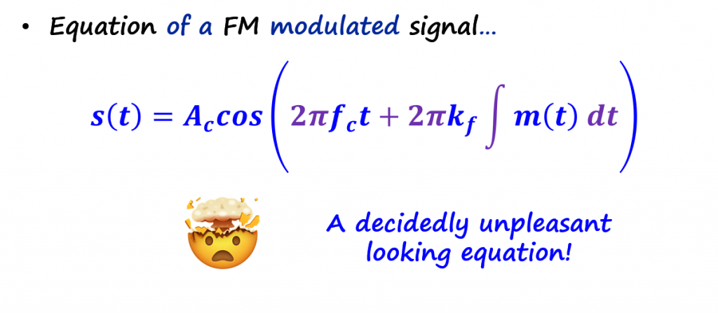 The math from this point on can be a bit intimidating at first, but we need to understand the concept of instantaneous frequency before spending time with analog FM modulation.
