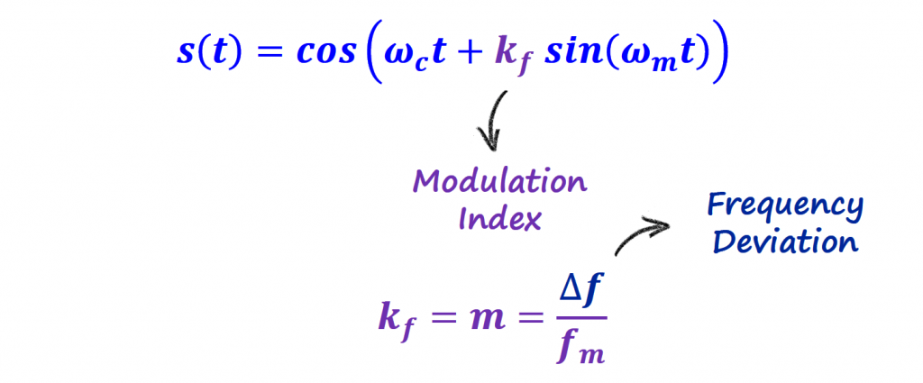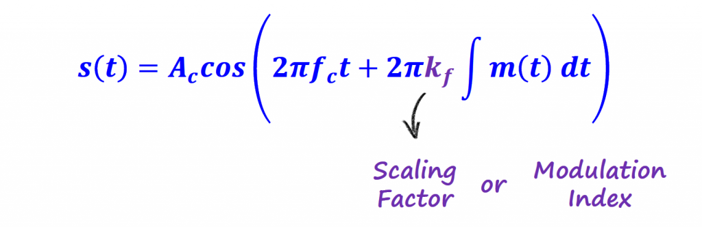 The scaling factor is also called modulation index (m), and m determines the occupied bandwidth. It is a measure of the bandwidth of the signal by taking the ratio between frequency deviation and the maximum frequency (fm) of the information signal (m(t)).