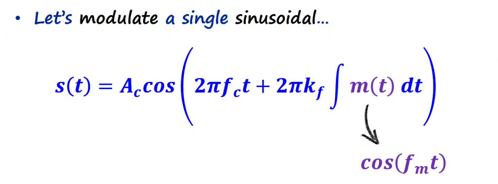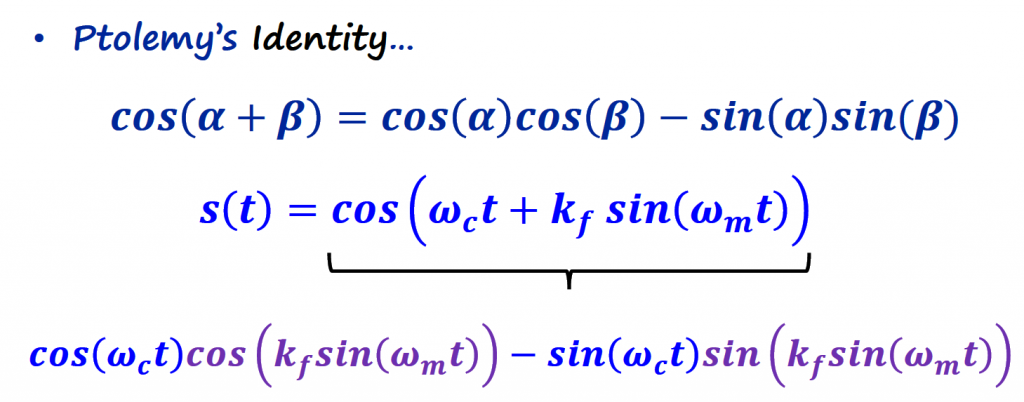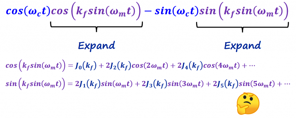 For simplicity, we make Ac = 1, and we absorb 2π into the scaling factor (kf). Let’s expand the cosine function using a trigonometry identity.